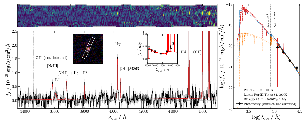 شکل ۱ – دادههای تصویری و طیفیِ کهکشان EXCELS-63107 در z = 8.27 که با تلسکوپ فضایی جیمز وب بهدست آمده است. در پنل چپ، تصویر رنگیِ ترکیبیِ NIRCam در سه فیلتر F200W، F365W و F444W دیده میشود. این کهکشان بسیار فشرده و تقریباً نقطهمانند است و موقعیت سه شاترِ ابزار NIRSpec/MSA نیز روی آن مشخص شده است. در بالا، طیفِ دوبعدی و در پایین، طیفِ تکبعدی نشان داده شده که خطوط نشری درخشان، مانند [O III] و [Ne III] را آشکار میکند؛ این خطوط بیانگر گازی بسیار داغ و کمفلز هستند. در پنل راست، طیف انرژیِ سه مدلِ مختلفِ منبعِ یونیزهکننده (نارنجی: BPASS، آبی: جمعیت III، قرمز: Wolf–Rayet) با دادههای فوتومتری (نقاط سیاه) مقایسه شده است.