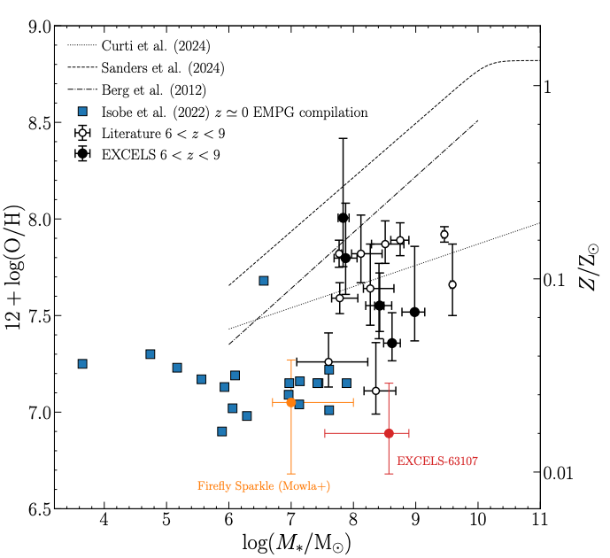برای درک بهتر جایگاه EXCELS-63107 در میان دیگر کهکشانها، پژوهشگران مقدار فلزیتِ اندازهگیریشده را در برابر جرم ستارهای آن رسم کردهاند (شکل ۲). در این نمودار، نقطهی قرمز کهکشان EXCELS-63107 را نشان میدهد که در پایینترین بخشِ رابطهی جرم–فلزیت قرار دارد، در کنار منابع بسیار کمفلز محلی (مربعهای آبی) و نمونههای ۶ < z < ۹ (دایرههای سیاه). خطوط سیاه روابط تجربی جرم–فلزیت را در کهکشانهای محلی (z ≈ ۰) و در کهکشانهای بسیار دور (انتقال به سرخ بین ۶ تا ۱۰) نشان میدهند. این جایگاه استثنایی تأیید میکند که EXCELS-63107 یکی از کمفلزترین اجرام ستارهزای شناختهشده با اندازهگیری مستقیم است و حد پایینِ فلزیت کهکشانها را در اوایل کیهان تعیین میکند.